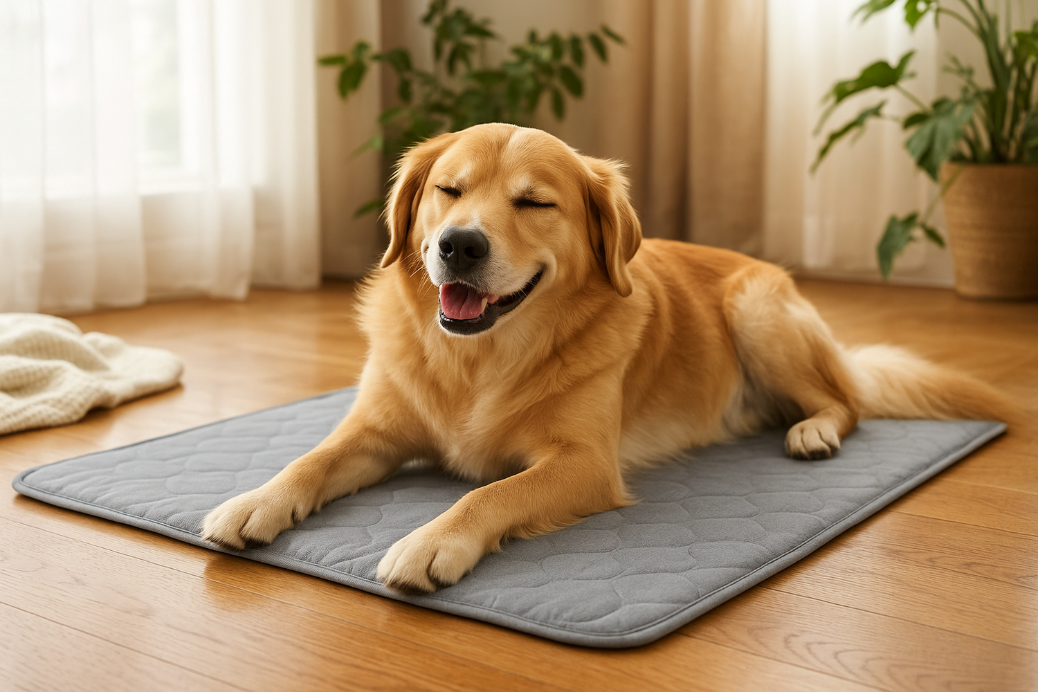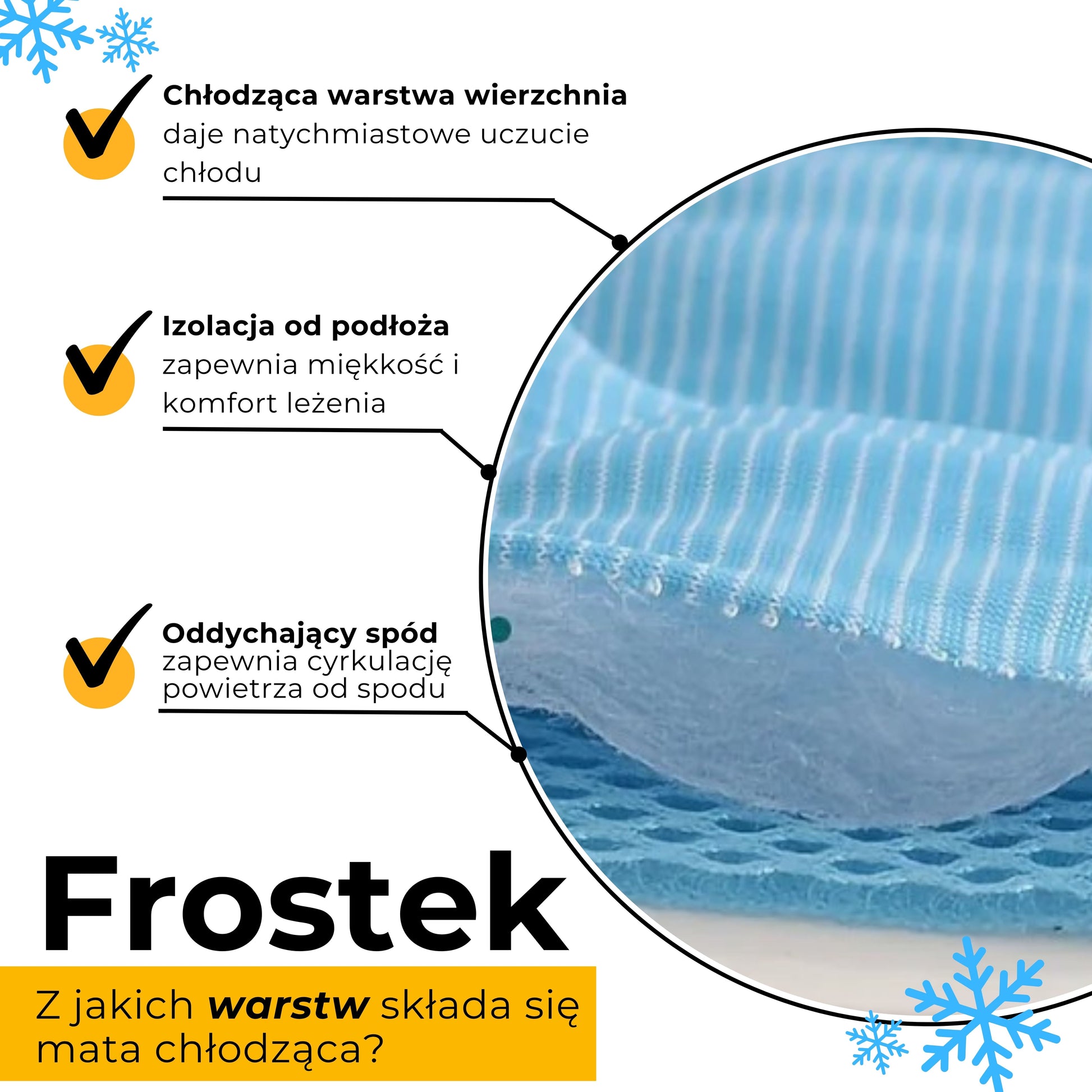 Mata FROSTEK wykorzystuje specjalną technologię cyrkulacji powietrza i naturalny przepływ chłodu — działa samoistnie pod naciskiem ciała zwierzaka, bez konieczności namaczania czy mrożenia.