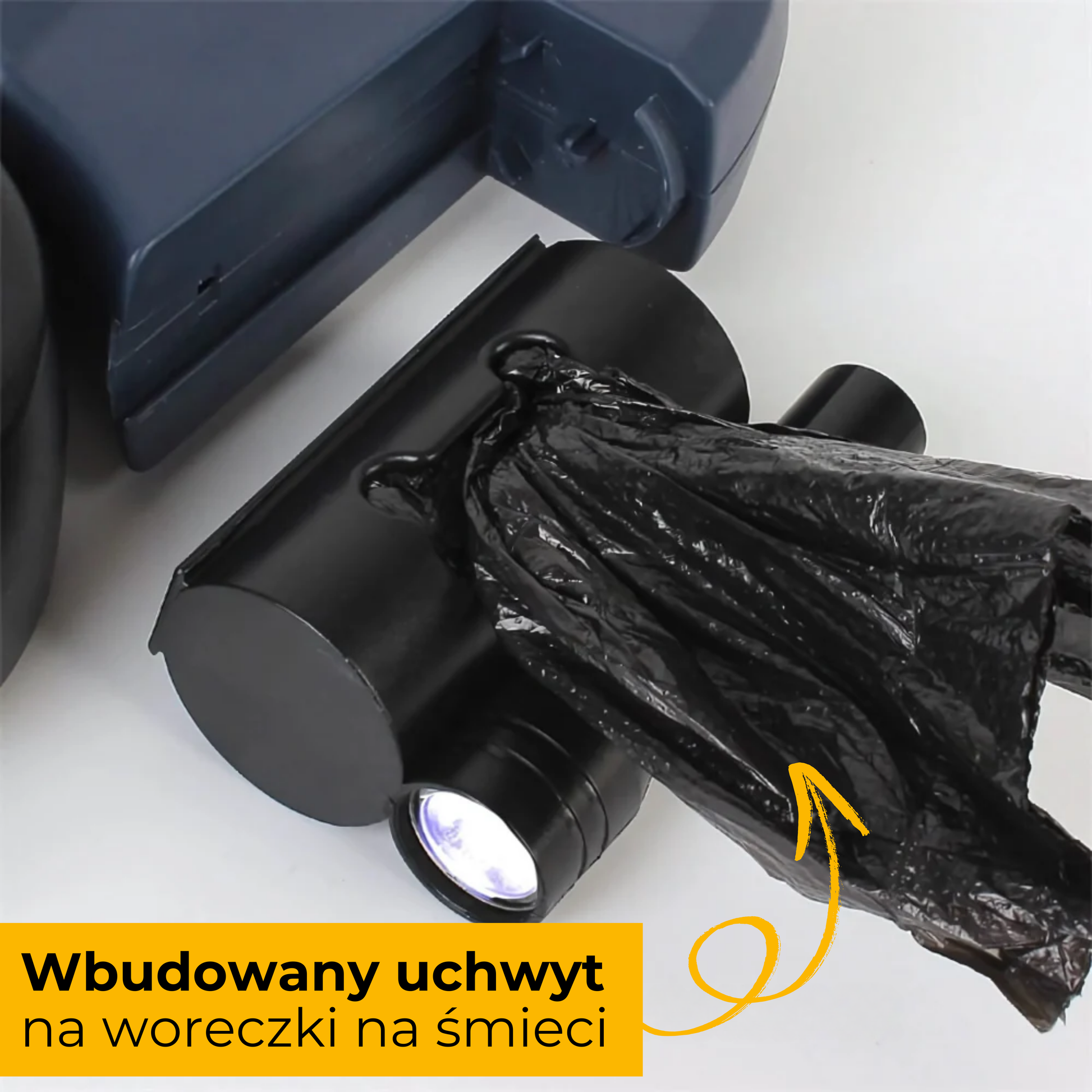 Wbudowana latarka LED zwiększa widoczność po zmroku, a praktyczny uchwyt na woreczki sprawia, że sprzątanie po pupilu jest szybkie i bezproblemowe.
