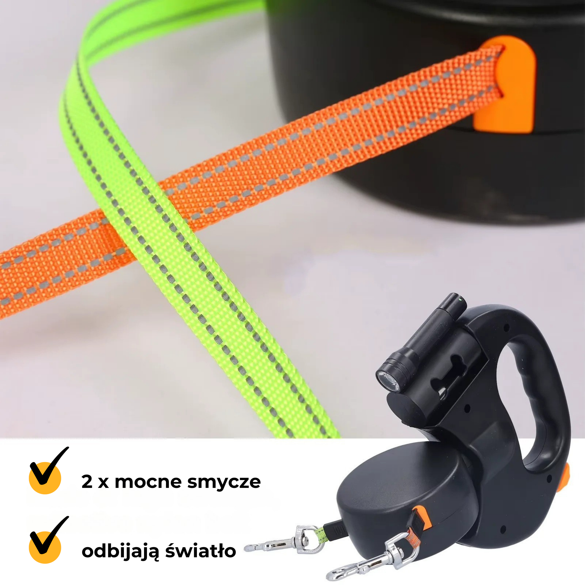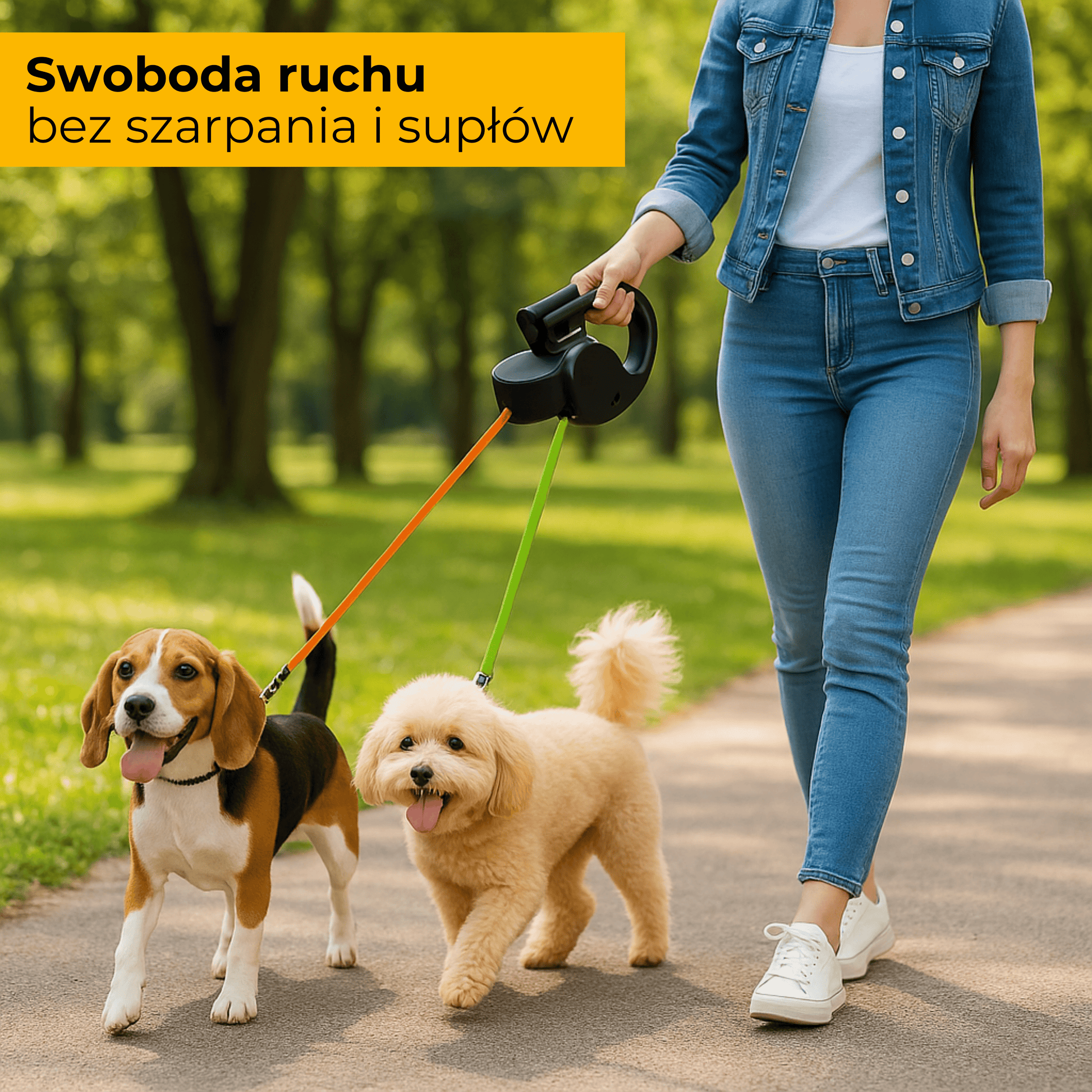 Komfort dla Ciebie i Twoich pupili – podwójna, automatycznie zwijana smycz sprawia, że prowadzenie dwóch psów naraz jest proste i wygodne.